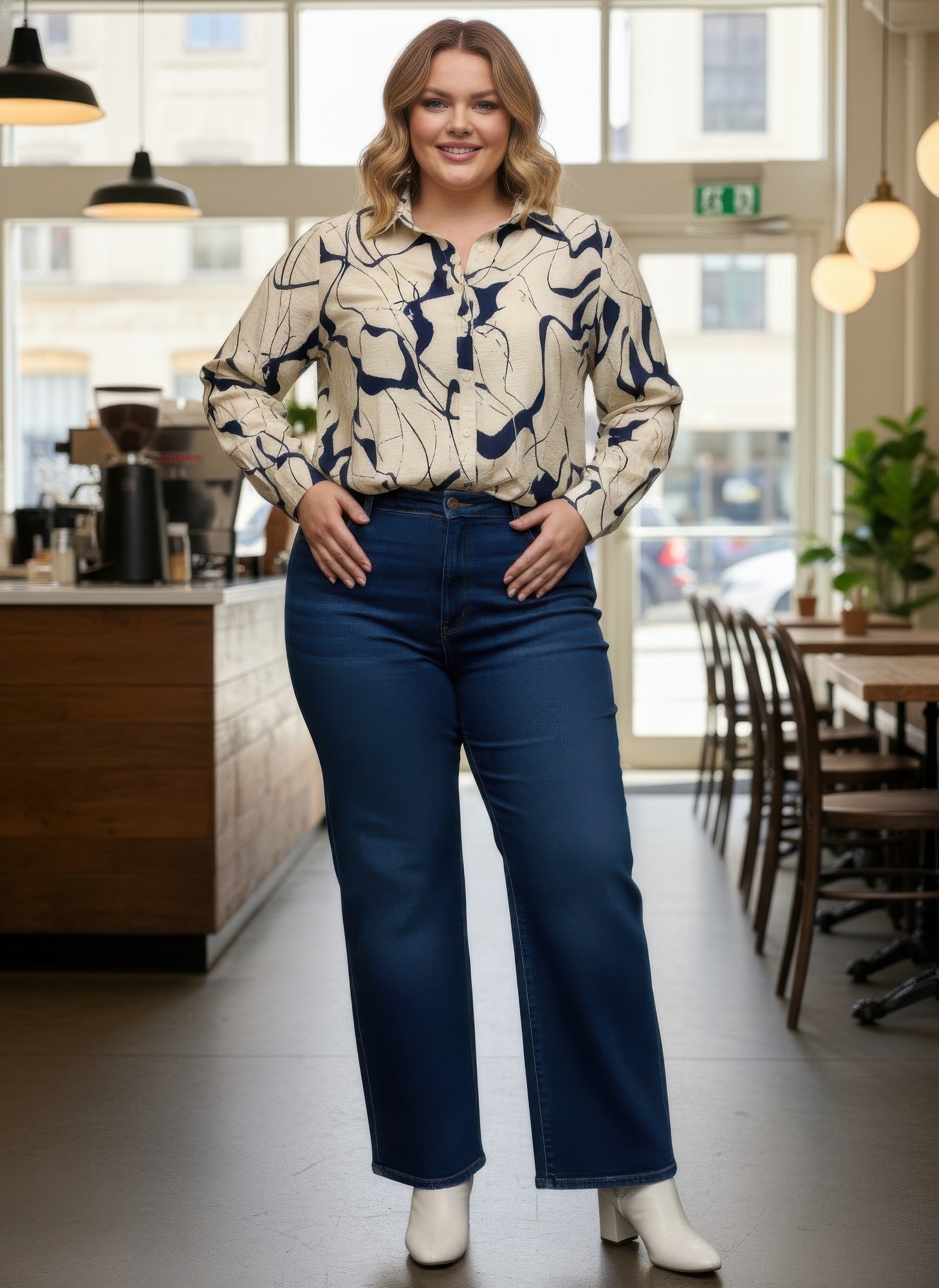 Elevate your everyday wardrobe with this sophisticated long-sleeve button-down. Featuring a bold, artistic abstract swirl pattern in navy over a creamy ivory base, this top strikes the perfect balance between professional and trendy. The classic collared neckline and relaxed fit make it an ideal choice for tucking into high-waisted denim or pairing with sleek trousers for the office.