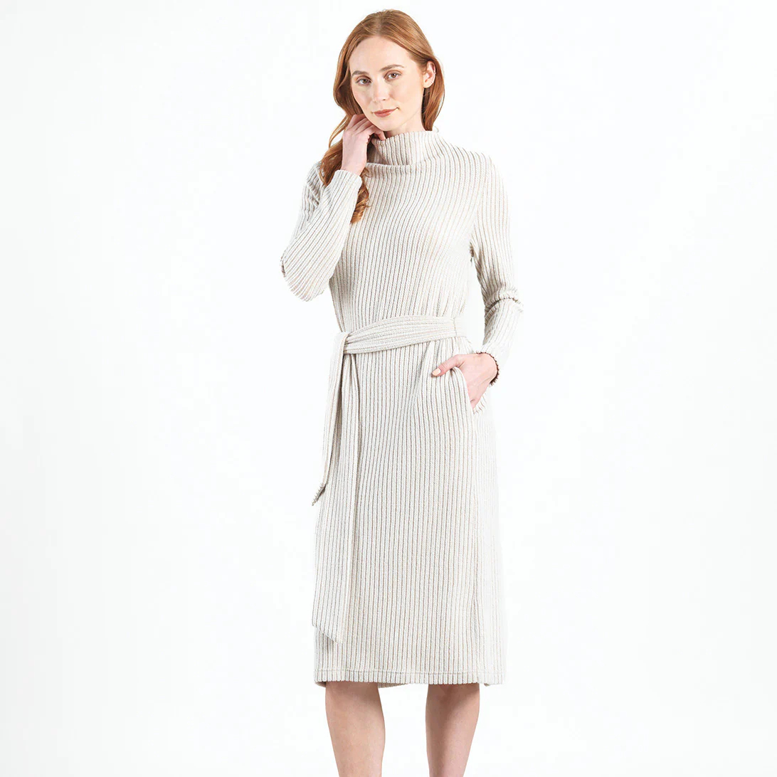Crafted in a chunky cotton-ribbed sweater knit, this dress delivers durable warmth, a beautiful heavy drape, and a texture that softens with every wear. Side pockets provide everyday practicality, and a 10" back slit adds ease of movement and a sophisticated touch. The Sand color features a creamy nude tone with neutral eggshell undertones—perfect for versatile, year-round styling.