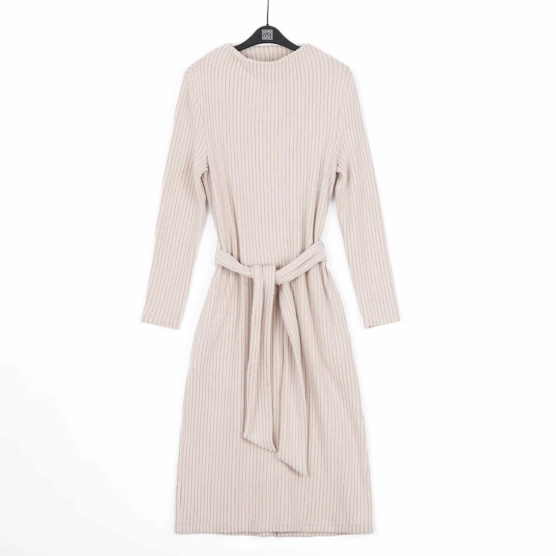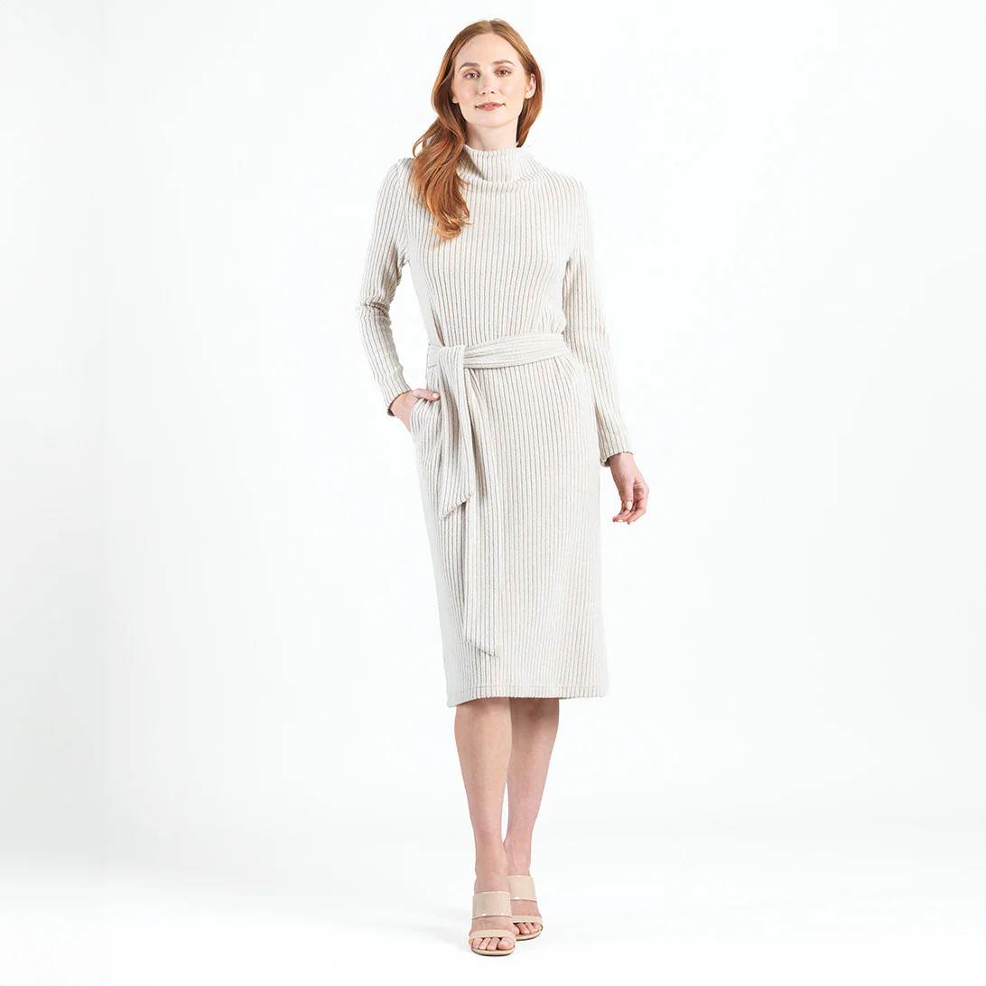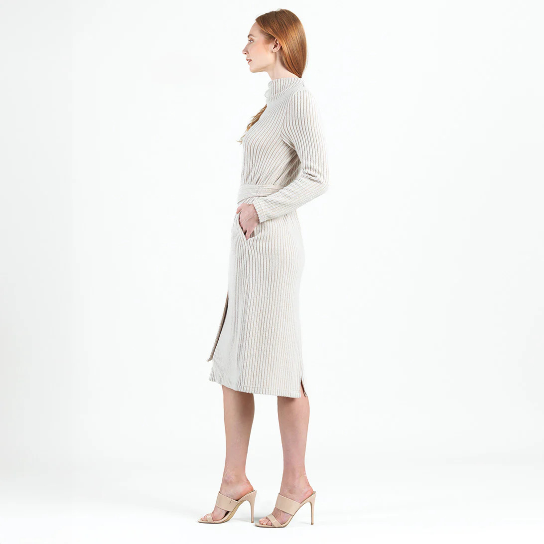 Crafted in a chunky cotton-ribbed sweater knit, this dress delivers durable warmth, a beautiful heavy drape, and a texture that softens with every wear. Side pockets provide everyday practicality, and a 10" back slit adds ease of movement and a sophisticated touch. The Sand color features a creamy nude tone with neutral eggshell undertones—perfect for versatile, year-round styling.