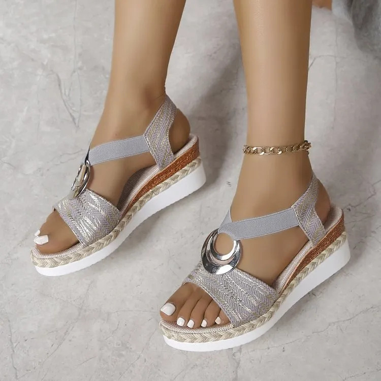 Elevate your summer wardrobe with these chic and comfortable platform sandals. Combining the classic aesthetic of an espadrille with modern athletic-inspired soles, these wedges offer a perfect blend of style and stability. The intricate etched patterns and metallic accents provide a sophisticated flair suitable for both casual outings and seaside evenings.