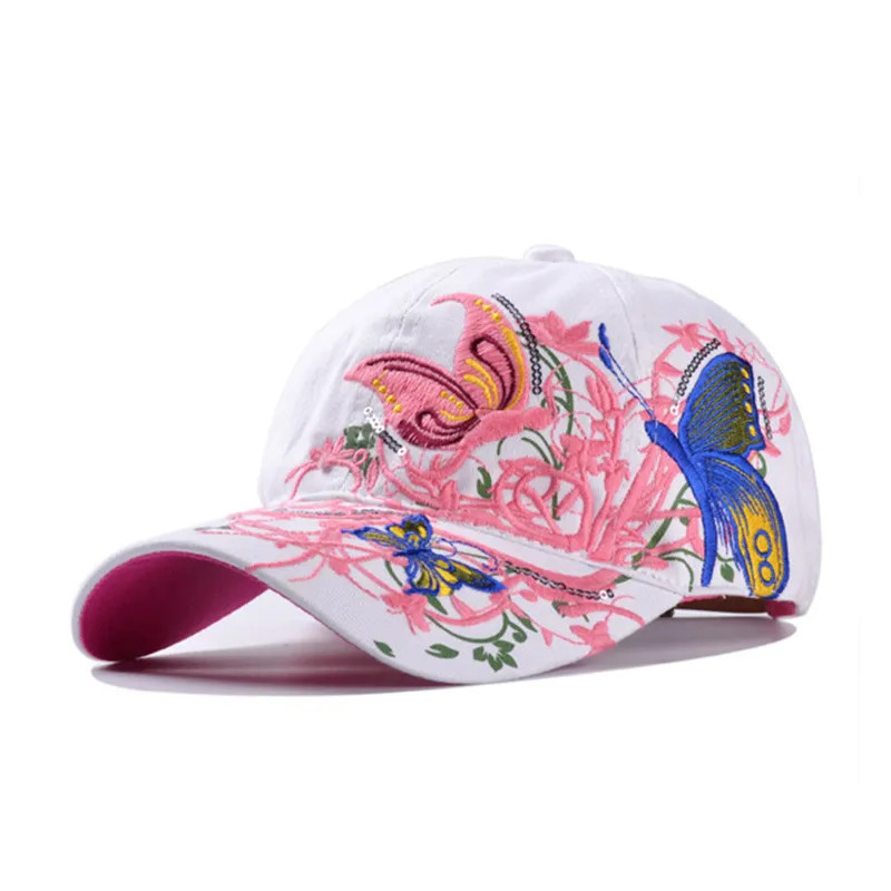 This eye-catching headpiece features a sophisticated and intricate design that elevates the classic baseball cap silhouette. Elaborately detailed butterfly and floral embroidery sweeps across the crown and onto the brim, creating a dynamic sense of movement.