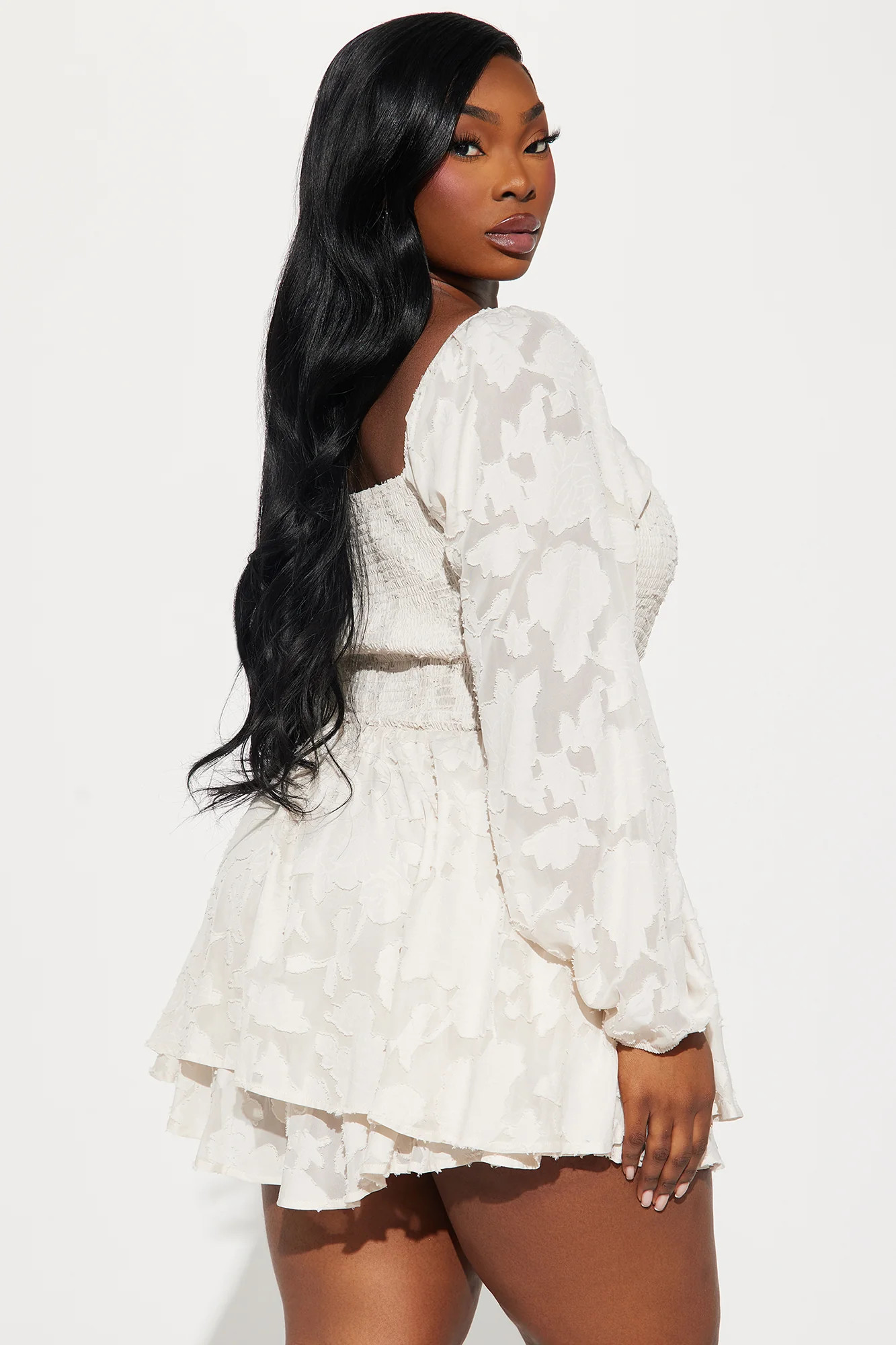 Step into effortless elegance with this stunning ivory romper, designed to blend romantic charm with a modern silhouette. Featuring an intricate floral burnout pattern, this piece offers a delicate, textured look that catches the light beautifully.