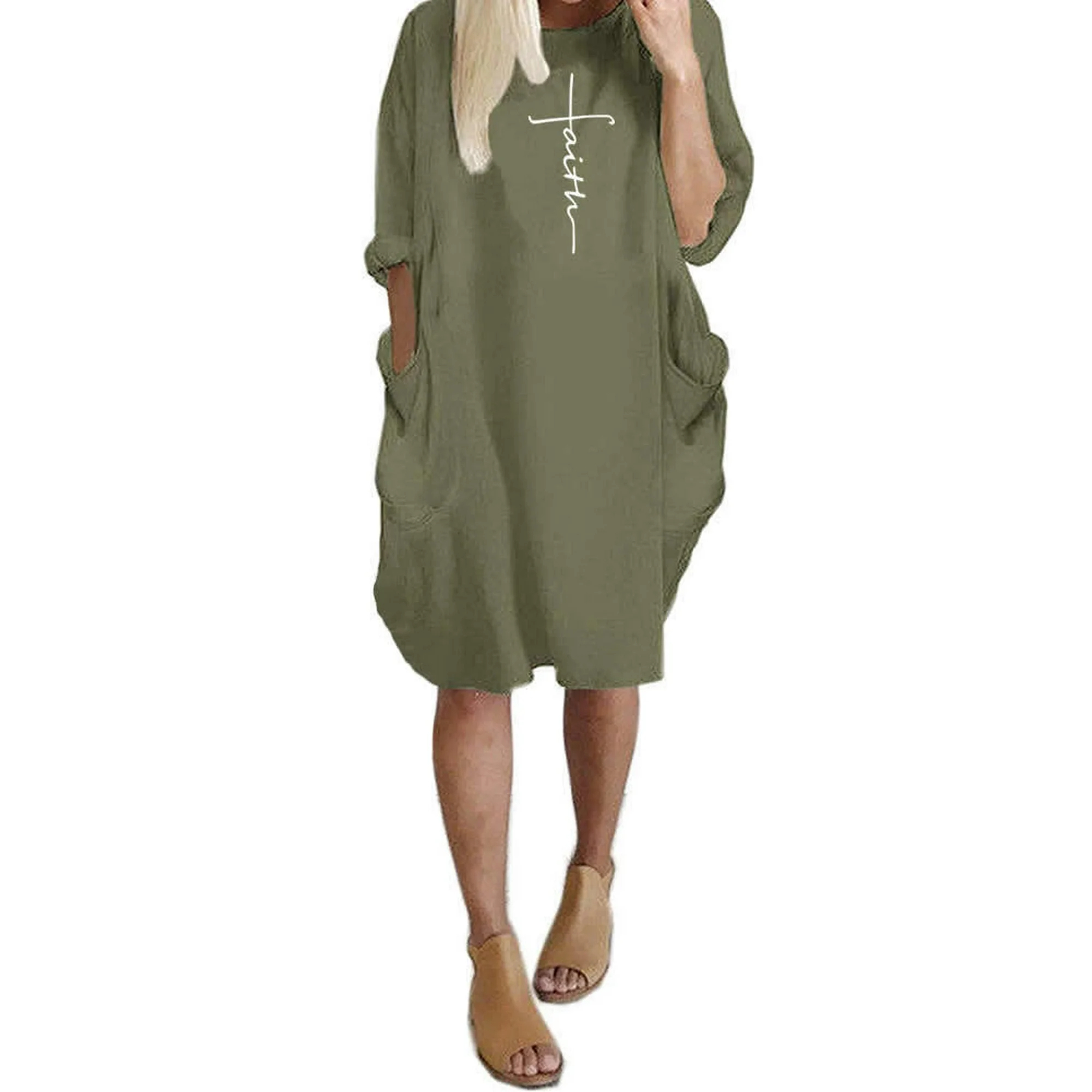 Wear your belief with quiet confidence in the Faith Over Fear Long Sleeve T-Shirt Dress. Made from soft, breathable polyester with a touch of micro-stretch, this relaxed silhouette drapes beautifully for everyday comfort while keeping a flattering shape. The minimalist “Faith” chest print adds a meaningful, stylish detail that elevates a casual look into something personal and inspiring.