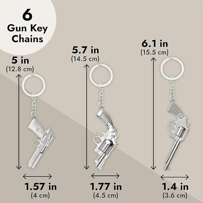Upgrade your key organization with the Juvale 6-Pack Mini Gun Keychains. Each piece adds a bold, stylish touch to your keys, bag, or car, combining functionality with a distinctive, collectible design.