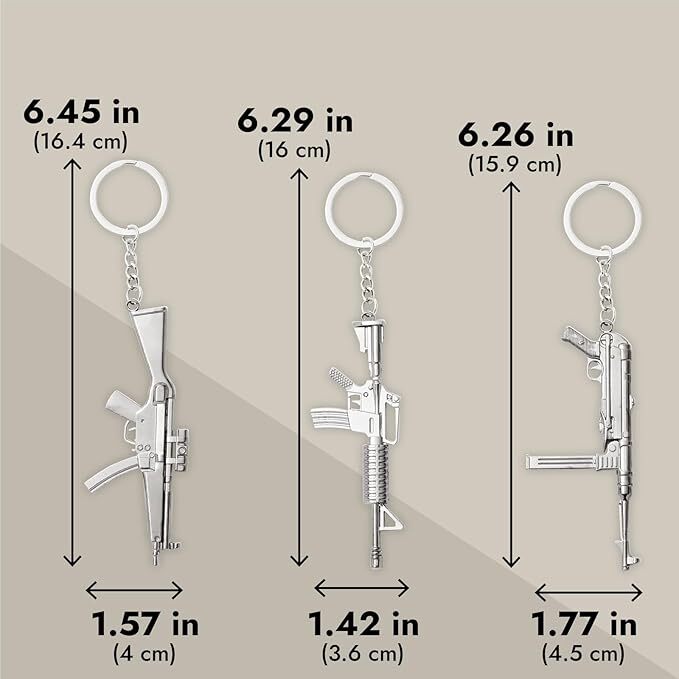This 6-piece set includes a variety of mini firearm designs, ranging from a semiautomatic pistol to an M4-style carbine. Each keychain features unique dimensions — from approximately 5 x 1.6 inches to 6.4 x 1.6 inches — giving you a diverse collection to mix and match.