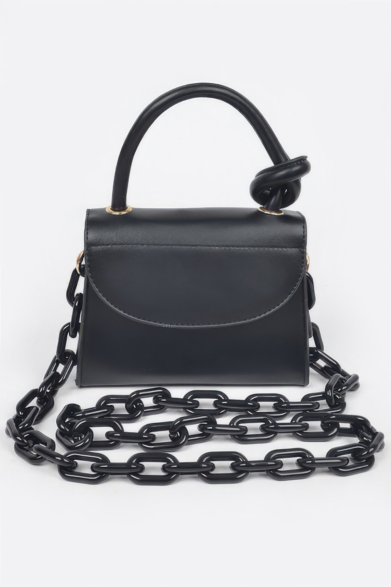 This knot handle chain crossbody bag features a modern design accented with a knot-style handle and a sleek chain strap. The structured silhouette keeps your essentials organized while maintaining a stylish profile. Its compact size makes it ideal for everyday use or evening outings. The polished finish enhances its refined appearance. A contemporary accessory, it adds a unique touch to your look.