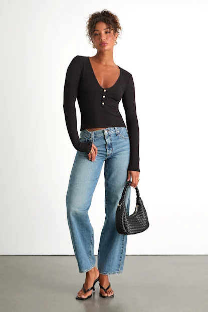 A flattering V-neckline and Henley-inspired button detail add subtle charm, while seamed cups enhance shape without sacrificing comfort. The decorative wood-look buttons bring a warm, seasonal touch, making this top perfect for both lounging and stepping out. Finished with a perfectly tuckable hem, it layers seamlessly under jackets, cardigans, or worn solo for effortless everyday style.