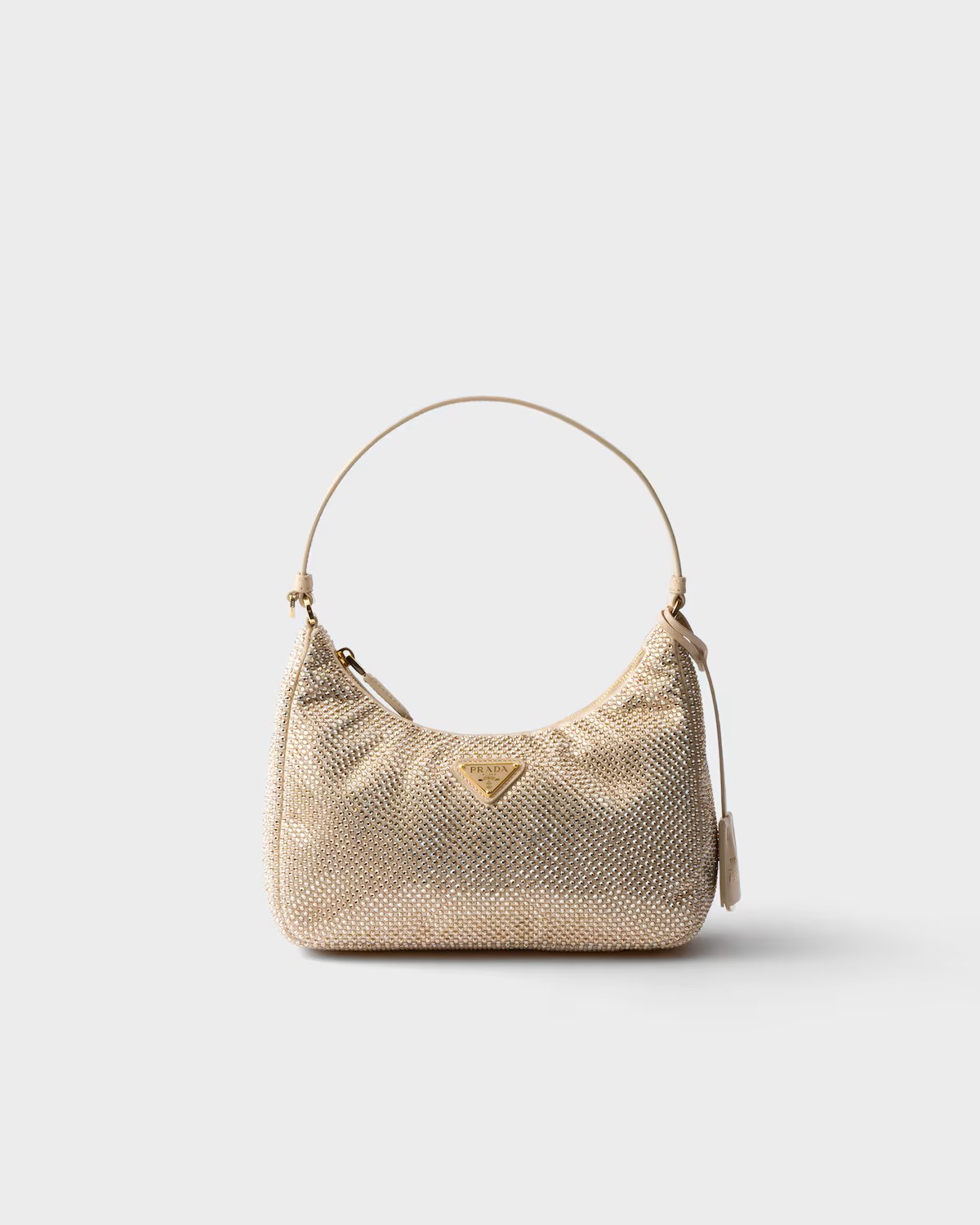 The Prada Re-Edition 2005 Crystal Satin Shoulder Bag reimagines an iconic silhouette with elevated glamour and exquisite detail. Inspired by Prada’s legendary nylon mini hobo, this luxurious version is crafted from lustrous satin and hand-applied crystals that shimmer beautifully with every movement.