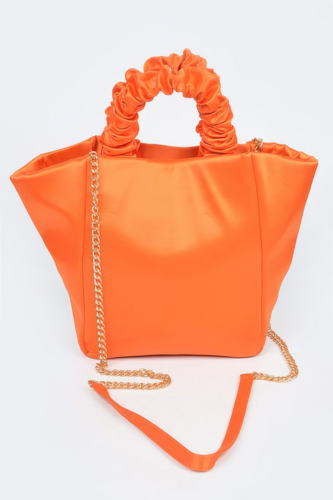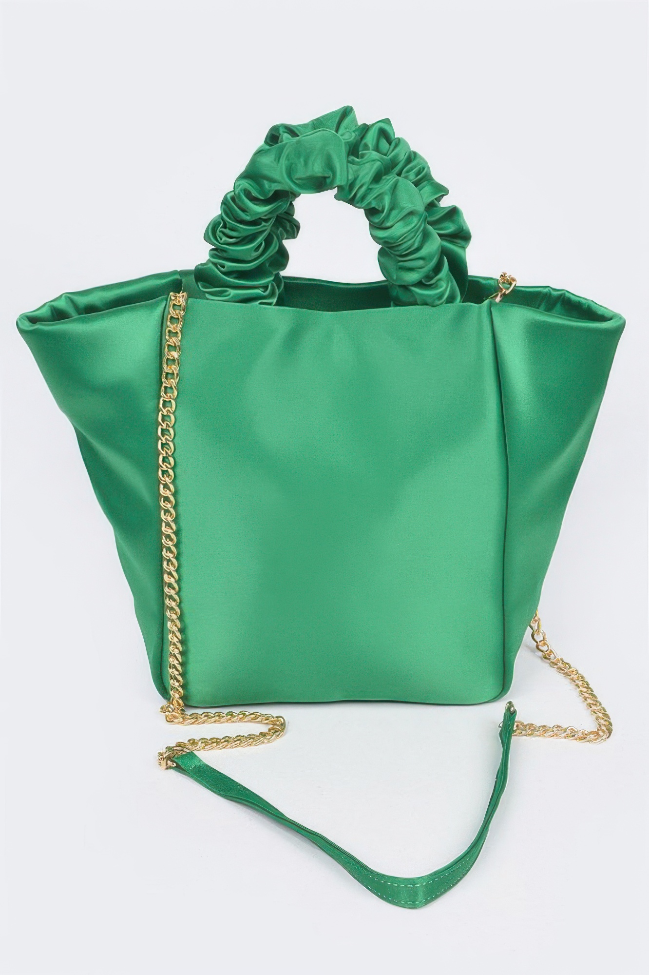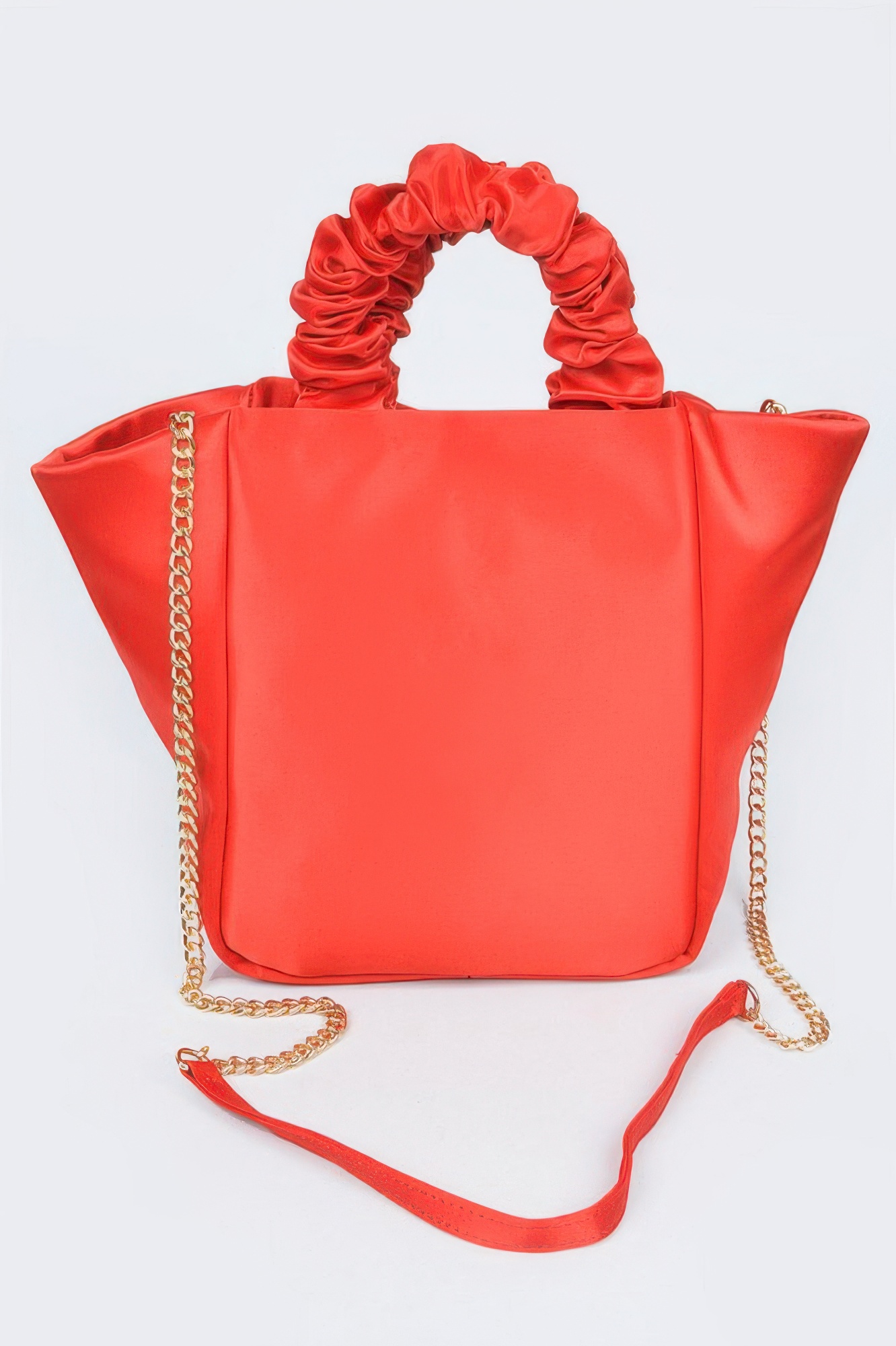 The Satin Tote Bag With Chain combines soft elegance with modern functionality. Crafted with a smooth satin exterior, this bag delivers a refined and polished look that complements a variety of outfits. The chain handle adds a stylish metallic accent while providing comfortable carrying options. Its spacious interior allows room for daily essentials while maintaining a sleek silhouette. The satin texture adds subtle shine that enhances both casual and evening styling. Mixed metal details provide structure and durability to the design. This tote bag offers a perfect blend of sophistication and practicality for everyday use.