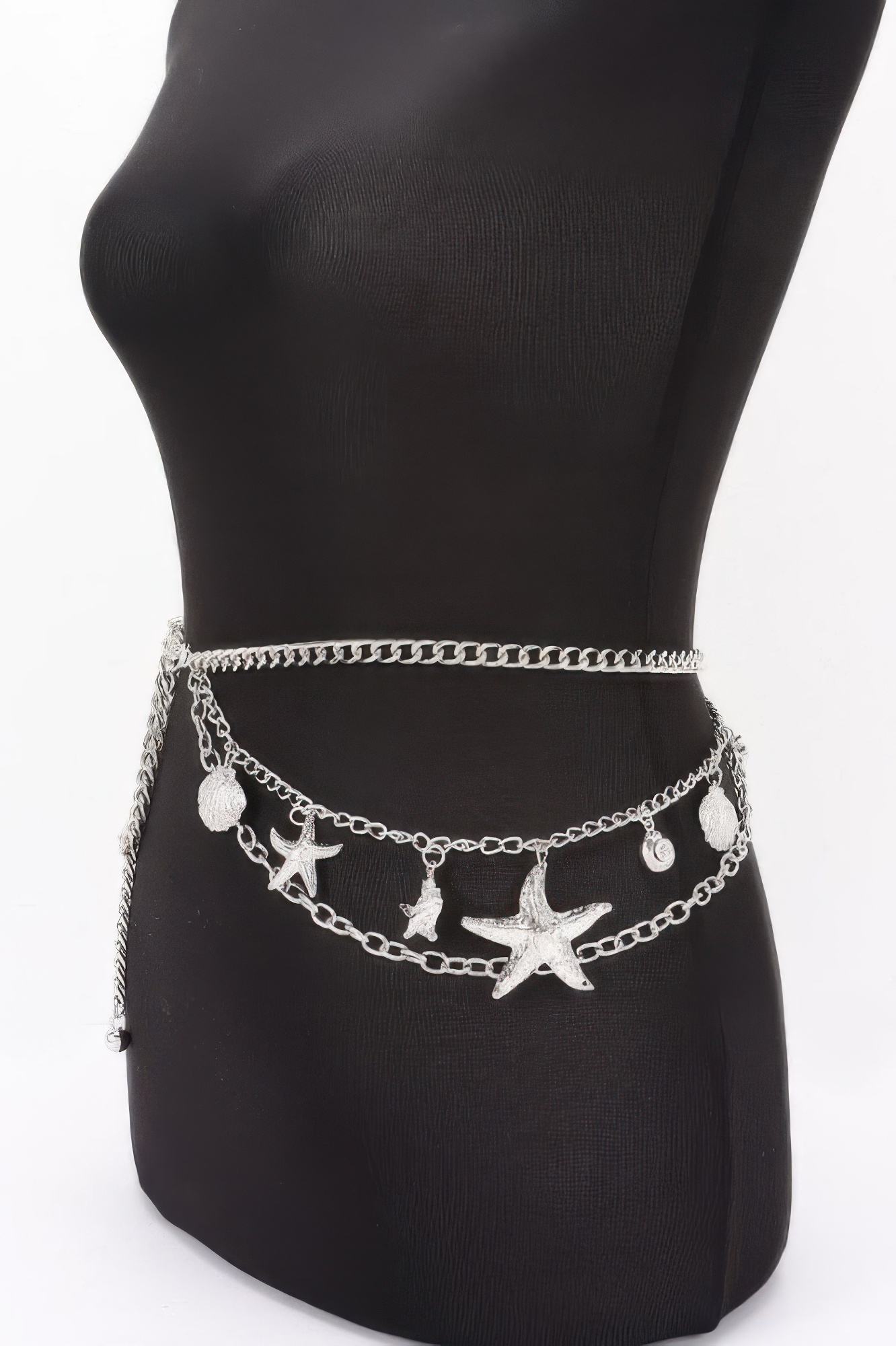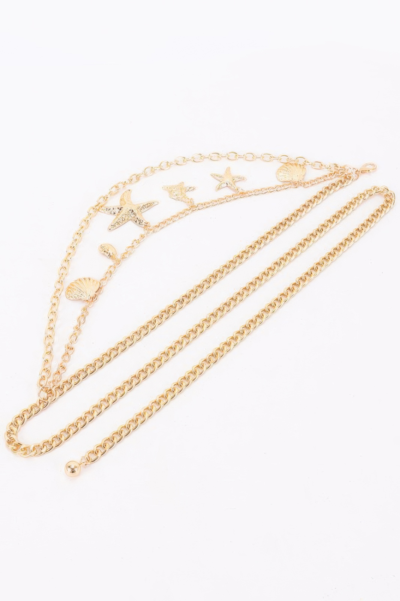 Add a touch of coastal elegance to any outfit with this stunning gold-tone layered chain belt. Designed to drape gracefully around the waist or hips, this accessory features a multi-strand design that creates a sophisticated, tiered look.