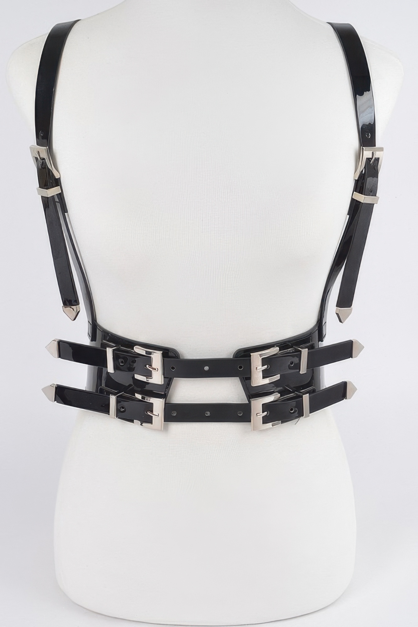 Elevate your silhouette with this striking Faux Leather Harness. Designed to be the ultimate statement accessory, this piece features a high-shine patent finish and intricate gold-tone buckle detailing. The adjustable shoulder straps and dual waist belts allow for a customized, cinched-in fit that perfectly accentuates your frame.